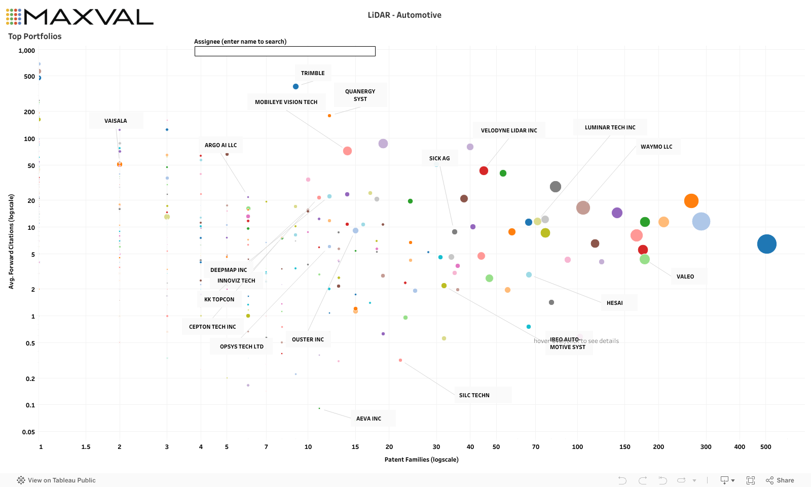 The relevant patent portfolios are compiled in the dashboard above, The location of the portfolios in the dashboard are based on both the size of patent families (X-axis) and the average number family citations (Y-axis). The dashboard can serve as a starting point to identify potential partners and suppliers. The right side of the chart is populated by automotive suppliers and OEMs, while the left side contains a mix of early-stage companies focusing on core LiDAR technologies, autonomous driving and other applications.