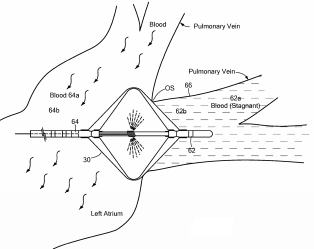 U.S. patent application, US20210169571, discloses a vein occlusion assessing system that includes an ablation catheter with a pair of temperature sensors that are longitudinally separated by an expandable element. The system determines the vessel occlusion based on the temperature difference between the first and the second temperature sensors when positioned near a target site. The figures below show the device achieving full and partial occlusion during the treatment.
