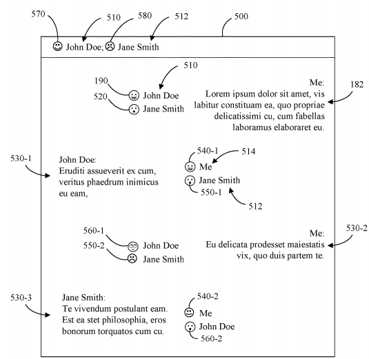 Die US-Patentanmeldung 20200169525 offenbart ein Verfahren zur Darstellung des Inhalts einer elektronischen Nachricht an einen Empfänger durch Einfügen von Antwortindikatoren in der Nähe des entsprechenden Teils des Inhalts, basierend auf den Gefühlen der Empfänger gegenüber dem Inhalt. Das System ermittelt die Gefühle des Empfängers, indem es die Gesten des Empfängers erfasst. Die folgende Abbildung zeigt eine Ansicht der elektronischen Nachricht, die von einer Benutzerschnittstelle einer Nachrichtenanwendung des Empfängers dargestellt wird.