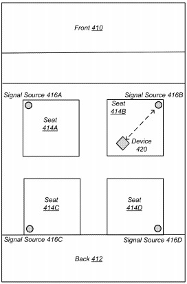 Die US-Patentanmeldung 20200169855 offenbart ein Verfahren zur Bestimmung des Standorts mobiler Geräte in einem Fahrzeug auf der Grundlage der Wechselwirkungen zwischen den Signalgeneratoren und Sensoren des Fahrzeugs und den Signalgeneratoren und Sensoren des mobilen Geräts. Das nachstehende Diagramm zeigt ein Fahrzeug mit einem Gerätelokalisierungssystem, das Signalsensoren verwendet, um den Standort eines Geräts zu bestimmen.