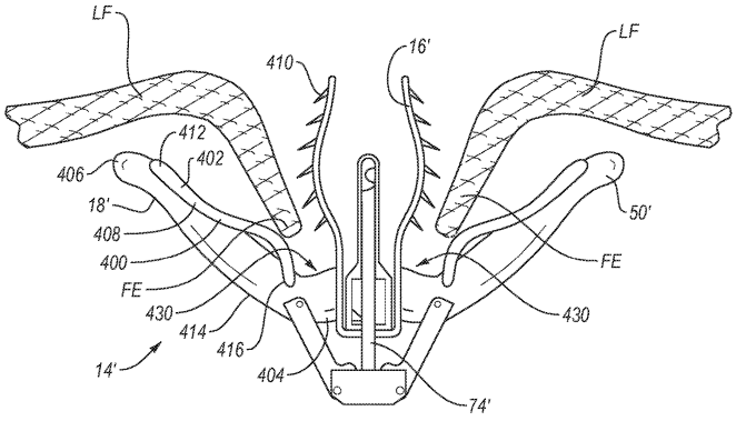 Die US-Patentanmeldung 20200163672 stellt eine Greifvorrichtung vor, die bei der Reparatur von Gewebe hilft, indem sie die Aufnahme von Gewebe in die Vorrichtung verbessert. Die Abbildung unten zeigt eine Ausführung der Fixiervorrichtung mit einer Blattfeder.