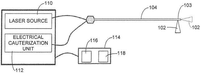 Die US-Patentanmeldung 20200163716 stellt eine Kauterisationsvorrichtung mit einem länglichen Körper vor, der ein distales Ende mit einer Öffnung hat, die die Abgabe von Laserenergie ermöglicht. Die Laserenergie wird von einer im distalen Ende befindlichen optischen Faser auf ein Gewebe gerichtet. Die Abbildung unten zeigt ein medizinisches Lasersystem mit elektrischer Kauterisation.