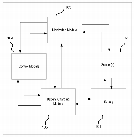 Die US-Patentanmeldung 20200169102 offenbart ein Gerät, das seine Batterie adaptiv auflädt, indem es die Temperatur, das Alter und den Außendruck der Batterie überwacht, auf der Grundlage der Überwachung ein Ladeprofil für die Batterie auswählt und die Batterie entsprechend dem ausgewählten Ladeprofil auflädt. Die folgende Abbildung zeigt ein Gerät mit adaptiver Batterieladung.