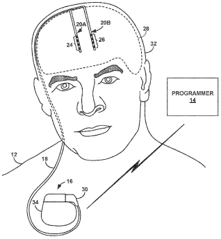 Eine weitere US-Patentanmeldung 20200164212 bezieht sich auf ein System zur Auswahl von Therapieprogrammen, das jedes Programm auf der Grundlage des zu erwartenden Gewebevolumens bewertet, das durch die Therapieabgabe gemäß dem Programm aktiviert werden soll. Auf der Grundlage der Bewertung wird eine elektrische Stimulationstherapie verabreicht. Die folgende Abbildung zeigt das Stimulationssystem, das die Therapie verabreicht.